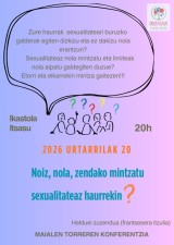 L'ikastola Arrokagarai organise une conférence avec Maialen Torre le mardi 20 janvier 2026 à 20h00 à l'ikastola sur le thème "Quand, comment et pourquoi aborder la sexualité avec les enfants ? Réservé aux adultes et ouvert à tous. Traduction en français.